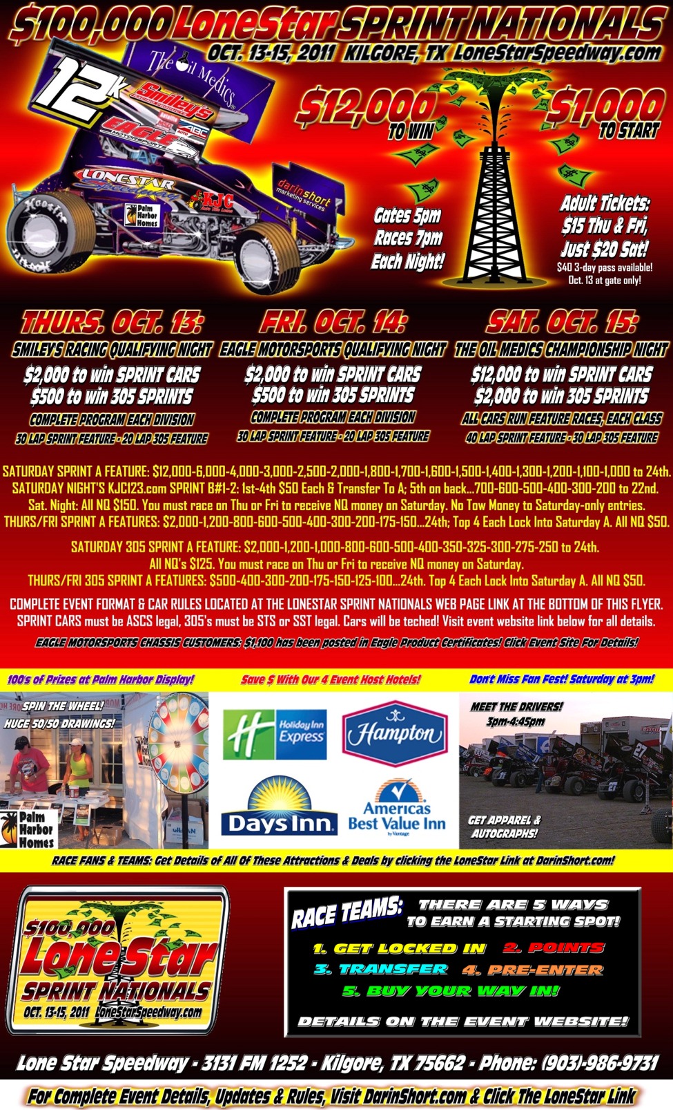 | Welcome to the 2011 LoneStar Speedway Sprint Nationals Registration & Information Website, Sponsored in part by Smiley's Racing Products , The Oil Medics , KJC Auto Title Loans , Eagle Motorsports, Palm Harbor Homes, Outlaw Wings , Bishop Racing Components, Kear's Speed Shop , DAY Motorsports & ABC Auto Parts! Click Navigation Buttons Above or Below for Driver Registration, Host Hotels, Event Info & Much More. For sponsorship inquiries or questions, feel free to email Darin at: dssm93@msn.com |