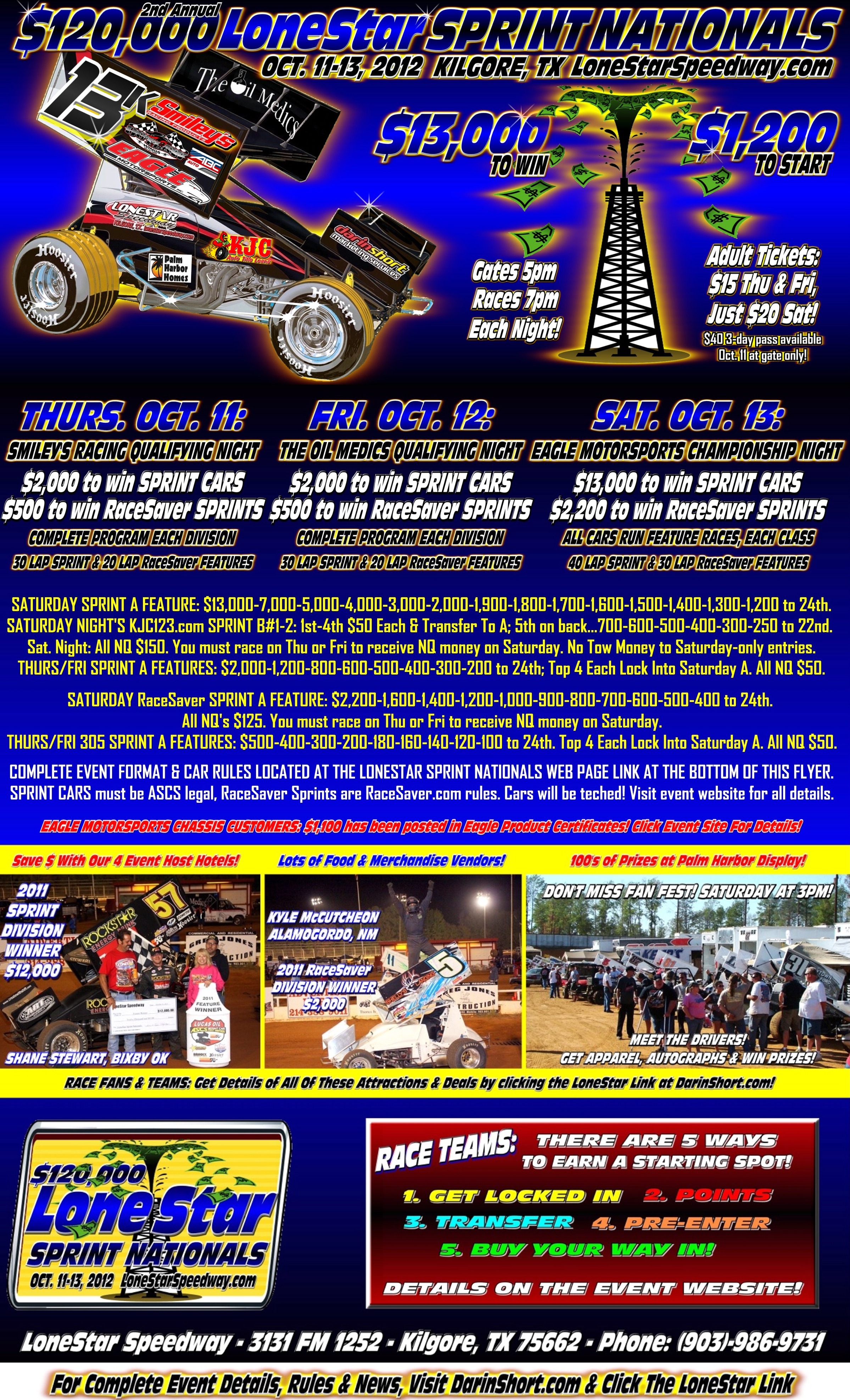 | Welcome to the 2012 LoneStar Speedway Sprint Nationals Registration & Information Website, Sponsored in part by Smiley's Racing Products , The Oil Medics , KJC Auto Title Loans , Eagle Motorsports , Palm Harbor Homes , Kear's Speed Shop , Outlaw Wings & ABC Auto Parts! Click Navigation Buttons Above or Below for Driver Registration, Host Hotels, Event Info & Much More. For sponsorship inquiries or questions, feel free to email Darin at: dssm93@msn.com. CLICK HERE FOR CAMPING INFO. |
