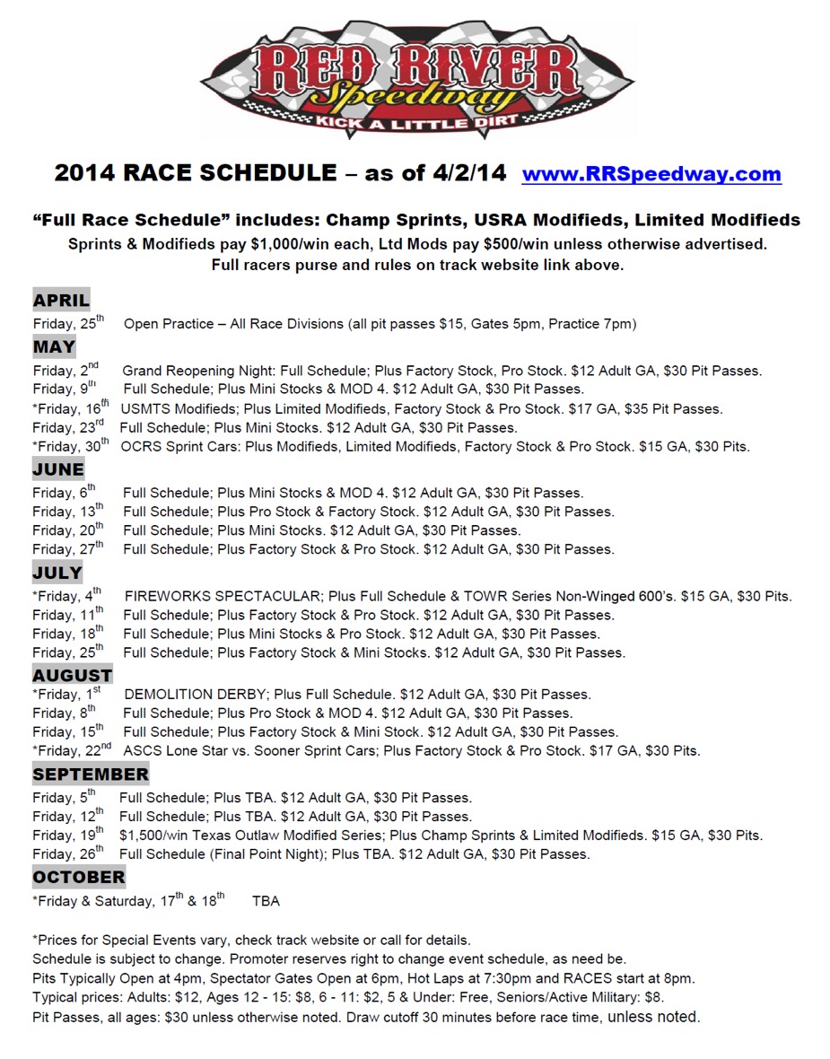 Here is the 2014 Red River Speedway dirt track schedule, as of 4/2/14. There will be more updates and additions as the season progresses (especially once we get towards September and October). The promoter reserves the right to edit or change the schedule as seen fit. Please check the schedule regularly for the latest updates. Click here for a printable version of schedule.